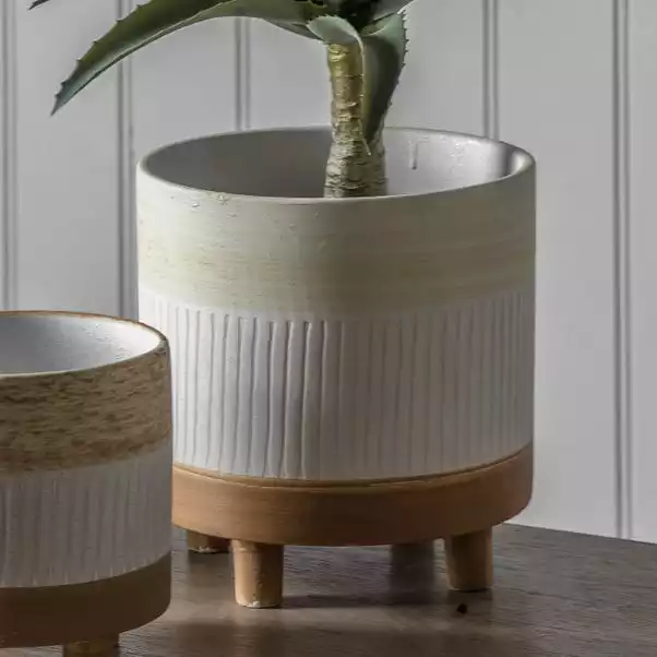Add a decorative touch to your home with this stylish and contemporary Eastling Pot. Beautifully designed with a brushed-type finish base and top, with white ribbed details in the centre. This stunning pot is perfect for displaying your favourite plants in any room of your home. Pair it with coordinating pieces from the Eastling range to create a beautiful plant display.