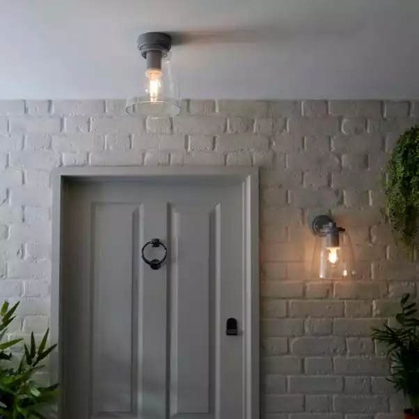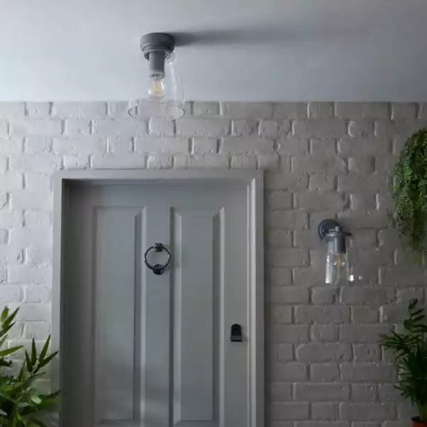 Featuring an understated, elegant design, the Hickory outdoor ceiling light is a great way to light your porch and other protected outdoor areas, or even your bathroom thanks to IP44 rating. This flush light fitting is finished in a stylish matt grey, complete with a clear glass shade, perfect for displaying a statement bulb. Matching items are also available to hlep you create a coordinated look.