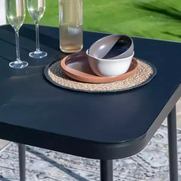 Enjoy dining al fresco with this beautiful 4-seater outdoor dining set. Made from robust aluminium and rattan for long-lasting use, this stylish contemporary set will bring a touch of sophistication to your outdoor space. Its tempered glass top ensures a clean and smooth surface, so you can dine in style whatever the weather. Perfect for garden get-togethers!