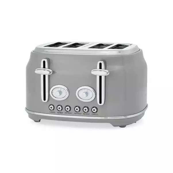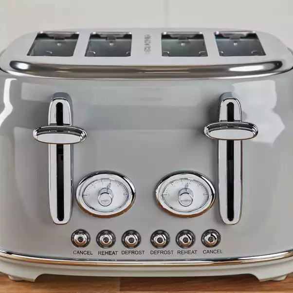 Designed in a modern grey colourway, our retro grey 4 slice toaster offers 1750W power output with integrated variable browning controls, variable width bread slots with centering guides and high lift facility suitable for the whole family. Designed with illuminated LED controls and a slide out crumb tray for ease of cleaning, this 4-slice toaster offers defrost, reheat and mid cycle cancel functions.