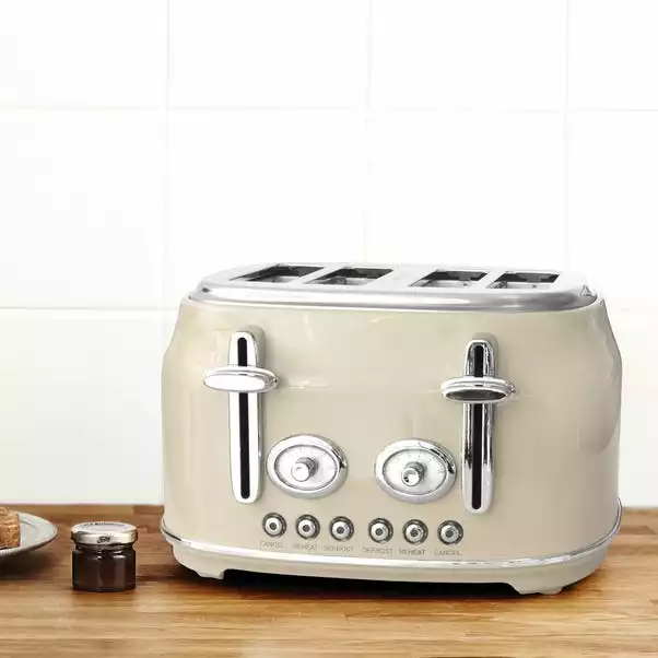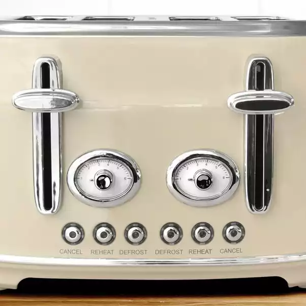 This Retro Cream 4 Slice Toaster will bring a unique retro design and a modern cream finish to your kitchen. This generous four slice capacity toaster is a perfect addition for any busy family. Featuring integrated variable browning control dials it is great for browning toast to all tastes and the variable width bread slots with centering guides is suitable for different thicknesses and types of bread for each family member. The high-lift facility helps to check the status during use safely and also features a defrost function for frozen bread, reheat function for bread already toasted and a mid cycle cancel function during use, great for multi-tasking users. The slide out crumb tray makes for easy cleaning after use helping to keep the toaster working at it’s best and prolongs the life.
