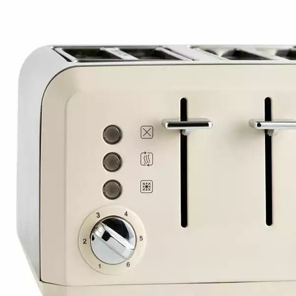 Perfect for busy families, this toaster has a four slice capacity and has been crafted with a classic cream finish suitable to compliment all types of kitchen decor. Featuring variable width bread slots this toaster can toast many different types of bread suitable to cater to all family members needs while also featuring a high lift facility so that you can see the status of the bread and can lift out safely. This toaster boasts defrost functions for frozen bread, reheat functions for bread already toasted and a mid cycle cancel function making this toaster the appliance to have for a busy morning. The slide out crumb tray assists with quick and easy cleaning after every use and helps to prolong the life of this toaster.