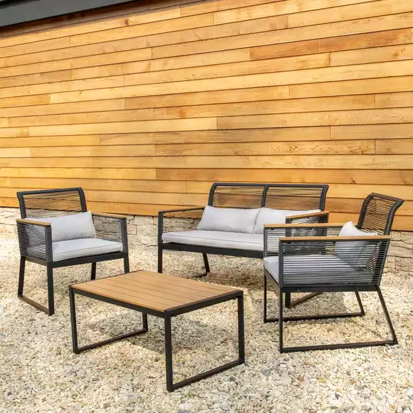 Relax this Summer in style with this Elements 4 Seater Black Rope Conversation Set. With 2 chairs and a double sofa, this set can seat 4 people. This conversation set includes stylish Polywood armrests and a tabletop to add a natural finish that perfectly compliments the modern black metal structure.