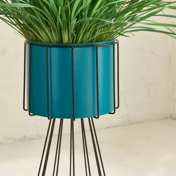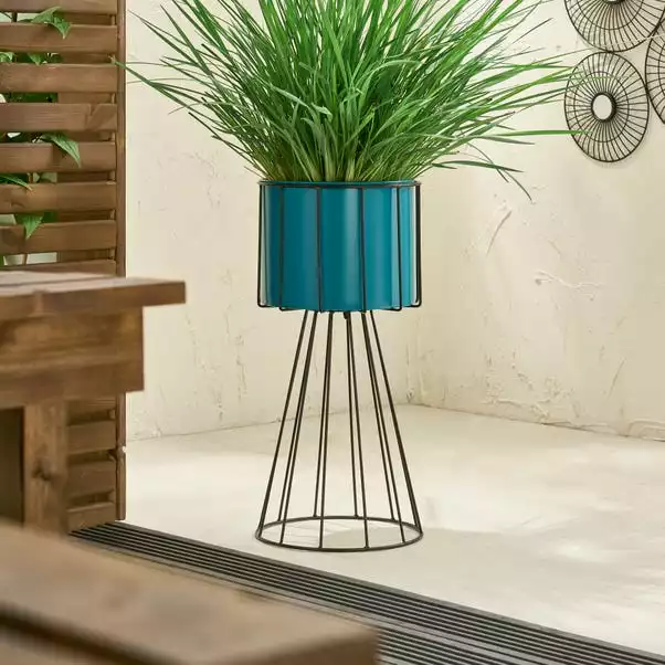 The Elements Teal Planter on Stand is a teal planter with a black stand, it comes fully assembled and is a good choice for decorating your indoor or outdoor space. Made from 100% metal, this planter on stand will make a stylish addition to any garden.